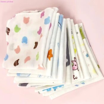 D0JC 10Pcs 20x20cm Baby Washcloths Set Cartoon Print Double Layer Gauze Infant Face Towel Reusable Wipes Absorbent Square