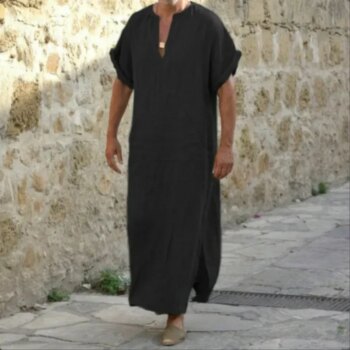 Ew Spring and Summer Models Men Muslim Style Mens Robe Simple Solid All-match Small V-neck Linen Comfortable Short Sleeve Robe